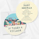 Celebrate your little one on the way with this unique round baby shower invitation featuring a charming pastel winter village and the heartfelt phrase “It takes a village.” Soft blue and yellow tones make it perfect for any gender. Customize the back with your event details, ideal for cozy seasonal gatherings or modern gender-neutral themes.