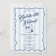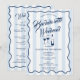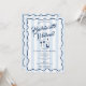 Um desenho colorido desenhado à mão de garrafa de vinho e copos. Um belo design perfeito para festas de despedida de solteira de fim de semana. Este convite de festa de despedida de solteira inclui um itinerário de fim de semana no verso. Um convite de despedida de solteira de fim de semana retrô moderno vintage azul e branco listrado.