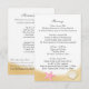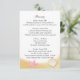 Conchas de ouro e estrelas-do-mar rosa decoram o cartão de informações do convite de casamento de praia. Itinerário de um lado e acomodações do outro. Personalize o texto como preferir.