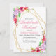 Flores de água-marinha boho rosa suave, lavanda e vermelhas dentro de uma moldura geométrica dupla dourada apresentam floreios botânicos. Personalize este convite de despedida de solteira com suas próprias cores e fontes ou mantenha esta tipografia popular como está para sua conveniência. Misture e combine com outros itens desta linda coleção de casamento.