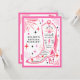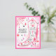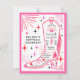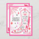 Convite de despedida de solteira temático de rodeio disco para cowgirl espacial com ilustração de bota de cowgirl com franja, rosa, raio, corações e estrelas com esquema de cores vermelho, rosa e preto. O verso tem o itinerário.