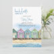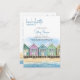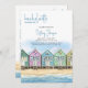 Convite de Fim de Semana de Solteira na Praia com Itinerário. Desenho em aquarela apresentando uma fileira de cabanas de praia coloridas e pintadas à mão na areia dourada à beira-mar, desfrutando de vistas para o mar e um céu azul de verão. O modelo está configurado para que você adicione detalhes do fim de semana e do organizador com o itinerário do fim de semana no verso. Se precisar fazer ajustes nos títulos ou no espaçamento, por exemplo, clique em "editar usando a ferramenta de design".
