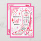 Convite de despedida de solteira com tema do último rodeio de cowgirl espacial e disco com ilustração de uma bota de cowgirl com franjas, rosa, raio, corações e estrelas com esquema de cores vermelho, rosa e preto. O verso tem o itinerário.