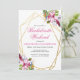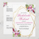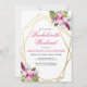 Flores tropicais em aquarela rosa e roxo suave dentro de uma moldura geométrica dupla dourada apresentam floreios botânicos e festivos. Personalize este convite de despedida de solteira com suas próprias cores e fontes ou mantenha esta tipografia popular como está para sua conveniência. Misture e combine com outros itens desta linda coleção de casamento.
