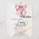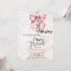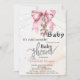 Cute baby shower invitation features a watercolor pink bow, Christmas balls, and string lights. These baby shower invitations are easily customized for your event by simply adding your details.