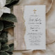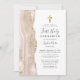 A borda esquerda deste elegante convite de primeira comunhão moderno apresenta uma aquarela de marfim, cortada com brilho dourado. Uma cruz de folha falsa de ouro aparece acima do texto personalizável, que combina escrita manual, chapa e fontes itálicas em cinzas de carvão em um fundo branco. O verso apresenta um marfim correspondente e um design de agate dourado.