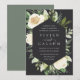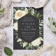 Nosso convite para o casamento de Ivory Bloom rodeia seus detalhes do dia do casamento com um moderno quadro geométrico hexagonal de verde-aquarela pintado, folhas de eucalipto, folhagem botânica, rosa branca e flores de pénia.
