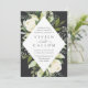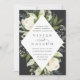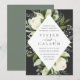 Nosso convite para o casamento de Ivory Bloom rodeia os detalhes do dia do seu casamento com uma estrutura geométrica moderna em forma de diamante de verde-aquarela pintada, folhas de eucalipto, folhagem botânica, rosa branca e flores de pénia.