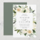 Nosso convite para o casamento de Ivory Bloom rodeia os detalhes do seu dia de casamento com um quadro quadrado de cor d'água verde pintada, folhas de eucalipto, folhagem botânica, rosa branca e flores de peônia.