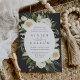 Nosso convite para o casamento de Ivory Bloom rodeia seus detalhes do dia do casamento com um gracioso quadro oval de verde-aquarela pintado, folhas de eucalipto, folhagem botânica, rosa branca e flores de peônia.