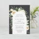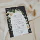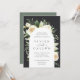 Nosso convite para o casamento de Ivory Bloom rodeia os detalhes do seu dia de casamento com um belo arco de cor d'água pintada, folhas de eucalipto, folhagem botânica, rosa branca e flores de pénia.