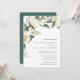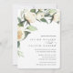 Nosso convite para o casamento da White Peony apresenta um buquê de coloração d'água pintada verde, folhagem botânica, rosa branca e flores de pénia. Personalize com seus detalhes de casamento em letras clássicas, alinhadas no canto inferior direito.