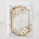 Create a serene and luxurious atmosphere for your special day with this stunningly elegant invitation. The design features a background of soft, icy azure marble, swirled with delicate veining and scattered with metallic glitter dust for a high-end, ethereal feel. The focal point is a magnificent ornate frame with a unique, Moroccan-inspired shape, outlined in a shimmering antique gilded texture that adds regal structure. Adorning the top left and bottom right of this frame are graceful arrangements of white cosmos and wildflowers, accented with sage leaves and intricate bronze metallic branches. This airy and sophisticated aesthetic is a flawless choice for a winter wonderland wedding, a spring garden bridal shower, or a luxurious high tea event. You might also select this polished design for a milestone birthday celebration, a "something blue" themed engagement party, or a formal anniversary dinner for a couple who loves refined elegance.