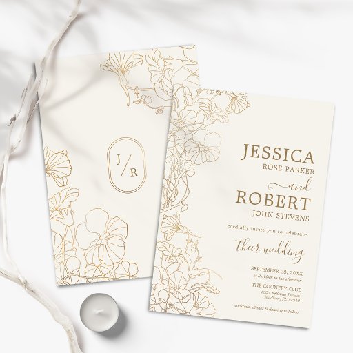 Convite de casamento floral em creme de marfim e folha de ouro falsa. Design de boho minimalista apresenta soalhos desenhados à mão, sotaques botânicos, letra de script de tipografia e monograma na parte de trás do cartão. Impressos convites Zazzle ou modelo de impressão digital instantânea para download.