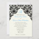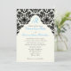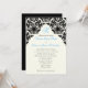 Este convite de casamento de marfim com damasco preto e sotaques azuis tem uma área para o seu monograma. Você também poderia usar a área para significar um aniversário. O tipo de papel e todo o texto são totalmente personalizáveis. Se necessitar de itens correspondentes neste design, envie um e-mail para niteowlstudio@gmail.com.