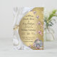 Cartões de convite de casamento únicos, com rendas de ouro, pérolas e anéis de ouro roscados por seda de marfim com fundo de mármore rosado.