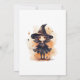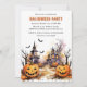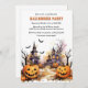 Um convite para a festa do Dia das Bruxas, com uma mansão assombrada, picos engraçados, morcegos e uma bruxa.