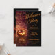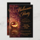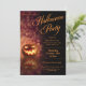 Feliz convite da Festa de Halloween de Jack O'Lantern com brilhos laranja num fundo preto. Perfeito para adultos ou adolescentes. Fatos Encorajados. Escrito Rustic Halloween Party