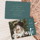 O anúncio e convite de festas de graduação modernos e em negrito apresenta sua foto favorita com "formando" sobreposto à tipografia de pincel em esboços manuais. Personalize com o nome do formando, o ano de aula e a escola ao longo do lado direito em uma banda chic de jasper de joia verde. Cartões inversos para revelar os detalhes da sua festa de formatura em cores correspondentes.