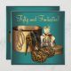 Jade elegante e modelo de convite de aniversário de alto salto de ouro. Este belo convite de aniversário azul teal e dourado 50º é facilmente personalizado para o seu evento, simplesmente escolhendo o botão "Personalizar!" para começar a adicionar os detalhes do seu evento, estilo da fonte, tamanho da fonte e cor e texto. Observe que todos os adesivos, cartões e designs de convite que você encontrará no Zazzle são gráficos impressos sem joias reais, arcos, levantados, gravados, ou peças ou peças adicionadas.