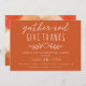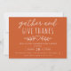 Celebrar Ação de Graças com seus entes queridos com este convite moderno e elegante. O convite inclui a palavra "reunir e dar obrigados", definida num fundo laranja queimado no outono. A maneira perfeita de convidar seus convidados para uma noite memorável de comida, diversão e palhaçada.