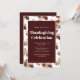 Janto Rustic de Ação de Graças Open House Convite com fundo vermelho e uma folhagem colorida de outono. Com a tipografia branca, você pode adicionar suas próprias informações. A parte de trás do convite tem um menu personalizável para compartilhar suas escolhas de cozinha com seus convidados. Um convite divertido para celebrar com entes queridos.