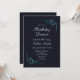 Um convite elegante de jantar de 50º aniversário em azul meia-noite profundo, apresentando cantos adornados com folhas florais ornamentadas em turquesa para enquadrar os detalhes do convite.