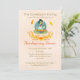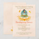 Um convite para o jantar de Ação de Graças com um design fofo de temporada. Um peru engraçado, vestindo um chapéu de peregrino e sentado com as pernas abertas, comendo torta de abóbora. Ele também tem uma expressão boba no rosto. Segurando uma faca e um garfo e pronto para se servir desse delicioso sobremesa.