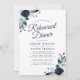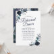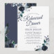Convites de jantar de ensaios de casamento navy elegantes com um fundo branco trendy que pode ser alterado para qualquer cor, flores de aquarela azul boho rústicas e um modelo de jantar de casamento moderno.