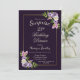Um aniversário de 21 anos surpreendente, roxo e lavanda, janta convite de festas, com penas roxas e púrpuras e delicadas folhas verdes de samambaia.