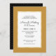 Este convite apresenta um tema de negócios clássico com uma fronteira dourada. Uma caixa branca com uma borda clara dourada oferece texto personalizado para que você adicione seu convite profissional ou de negócios. O dorso é preto com um pequeno padrão geométrico dourado.