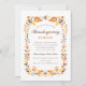 Laranja, marrom, amarelo, um toque de verde neste caloroso mas moderno convite jante de ação de graças. Todo o texto é personalizável; edite-o para se adequar ao seu evento (janto, azar, evento de caridade, arrecadação de fundos, etc.).