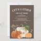 Janto de Ação de Graças Marrom e laranja para amigos e/ou família. As bombas bonito de laranja e branco e o ouro brilhante caem folhas com texto, "Vamos recolhe e dá obrigados." Adicione suas informações de janto e localização a este belo cartão.