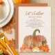 Janto de Ação de Graças para amigos e/ou família. A abóbora laranja e o ouro brilhante caem folhas com texto, "Vamos se reúne e dá obrigados." Adicione suas informações de janto e localização a este belo cartão.
