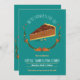 Um convite virtual de Ação de Graças com um sorridente pedaço de torta de pecan pronto para o feriado. Todo o texto é personalizável. A cor de fundo tem um tom mais escuro.