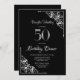 Um convite de janto de 50 anos preto-e-branco com cantos diagonais de local de ornamentado para enquadrar o texto branco.