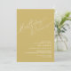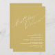 Convites de janto de aniversário elegantes e simplistas que incluem o texto do título "Janto de aniversário" numa letra manuscrita. Design moderno, externo ao centro, com detalhes de eventos no canto inferior direito. Texto branco sobre fundo amarelo ouro.