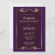 Um elegante convite de festas de aniversário de surpresa roxo, com um quadro roxo e um ornamentado de folha de ouro.