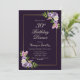 Um 30 de aniversário floral roxo, lavanda e cor-de-rosa janta convite de festas com penas roxas e penas delicadas de samambaia verde.