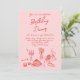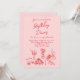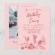 Se você está procurando por um convite único de aniversário elegante e facilmente editado, este é perfeito para você. Como vocês podem ver, ele apresenta um roteiro escrito de mão vermelha com JANTO branco BIRTHDAY em fundo rosa. Com uma mão vermelha colorida, desenhada TABLEWARE de vinho, uvas, bolo, buquê floral, pão e velas. Com RSVP no verso e foto personalizável. Com informações inteiras que podem ser personalizadas facilmente clicando no botão personalizar. Este convite de aniversário de tendências Quirky e exclusivo também é um convite eletrônico digital se você quiser enviá-lo por e-mail ou texto. Então pegue e faça seus convites verdadeiramente engajados.