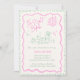 Este estilo trendy desenhado para o ensaio de casamento ilustrado com o convite de janto de ensaio de casamento apresenta uma bola de disco escrivável e elementos de mesa jantados. O design bicho-branco e peculiar inclui fontes escritas à mão e rabiscos de celebração. Cores verdes e cor-de-rosa para o clássico e moderno papel de carta de casamento.