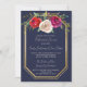 Um belo convite para janto de ensaio floral, com flores de rosa, cor-de-água, cor-de-rosa, cor vermelha, ameixa e cor-de-água + uma moldura de ouro contra fundo azul marinho. Por favor, contacte-me se quiser ajudar a personalizar este convite de janto de ensaio.