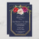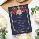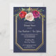 Um belo convite para janto de ensaio floral, com flores de rosa, cor-de-água, cor-de-rosa, cor vermelha, ameixa e cor-de-água + uma moldura de ouro contra fundo azul marinho. Por favor, contacte-me se quiser ajudar a personalizar este convite de janto de ensaio.