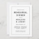 Esse convite elegante e minimalista de janto de ensaio apresenta o texto em prato preto e itálico, emoldurado por uma fina linha preta sobre fundo branco. O reverso é preto sólido.