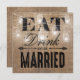 Estes convites de janto de ensaio de campo, brancos, vêm como um conjunto de casamento correspondente, com um fundo de efeito de burlap, marrom-rústico, luzes brilhantes de borda de jarro, as palavras "EAT, DRINK AND BE CASADO" e seus detalhes de ensaio no verso.
