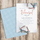 Este design apresenta um simples caranguejo azul-aquarela Convite para Janto de ensaio com um padrão de toalha de gingham azul e com um assar de caranguejo náutico, um mar oceânico litorâneo vivo, excelente para grupos de janto de marisco convite para eventos de festa, um texto de tipografia de tendência na moda, uma tipografia moderna do roteiro de caligrafia, com um estilo Maine Nova Inglaterra Maryland, coxas de caranguejo-sical cozidas, um elegante oceano de água na moda divertida, com um marinheiro azul-crustáceo, com água azul, oceano, convite náutico marinho