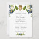 Este design rodeia o ensaio da sua cerimônia e janta detalhes com folhas, flores e bolotas salpicantes pintadas em delicada paleta de aquarelas verdes e cinzentos, com flores azuis sólidas