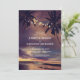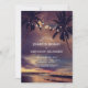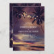 Romântica vintage praia púrpura de pôr do sol convite para ensaio jantado com palmas e lanternas.