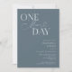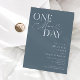 Convite minimalista de janto de ensaio de casamento com texto tipográfico que diz "mais um dia". O fundo é azul de aço.