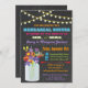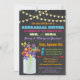 Bonito, elegante e moderno, este janto de ensaio apresenta luzes cintilantes, um jarro de pedras com flores silvestres, tipografia divertida e um fundo de quadro. Perfeito para qualquer comemoração pré-casamento! O texto é: "depois de anos de duro e dedicação, é hora de férias permanentes. Entre em contato comigo com quaisquer problemas ou mudanças que você possa ter em tkatz@me.com A ilustração desenhada manualmente pelo McBooboo.